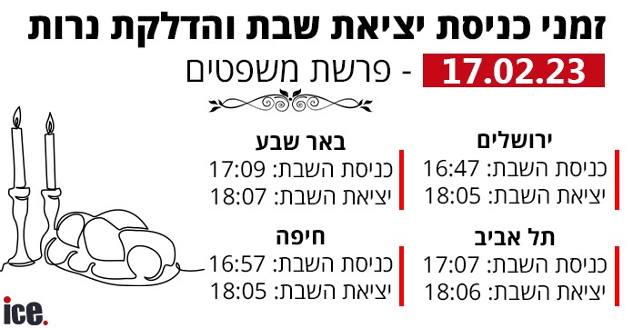 רגע לפני שהשבת נכנסת, ice עושה לכם סדר, כמדי שבוע בזמני כניסת יציאת שבת והדלקת נרות. והשבוע, פרשת 'משפטים' לשבת של ה-17.2.2023 עד מוצאי שבת ב-18.2.2023. וגם: מה מזג האוויר הצפוי לסוף השבוע?