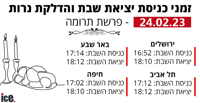 רגע לפני שהשבת נכנסת, ice עושה לכם סדר, כמדי שבוע בזמני כניסת יציאת שבת והדלקת נרות. והשבוע, פרשת 'תרומה' לשבת של ה-24.2.2023 עד מוצאי שבת ב-25.2.2023. וגם: מה מזג האוויר הצפוי לסוף השבוע?
