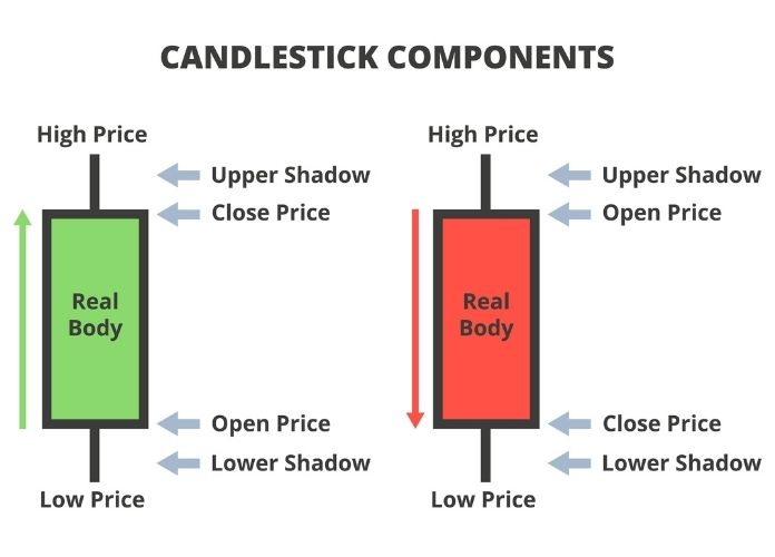 הגוף: מראה את ההפרש בין מחיר הפתיחה למחיר הסגירה. אם הנר ירוק (או לבן), המחיר עלה (הקונים ניצחו). אם הוא אדום (או שחור), המחיר ירד (המוכרים ניצחו).