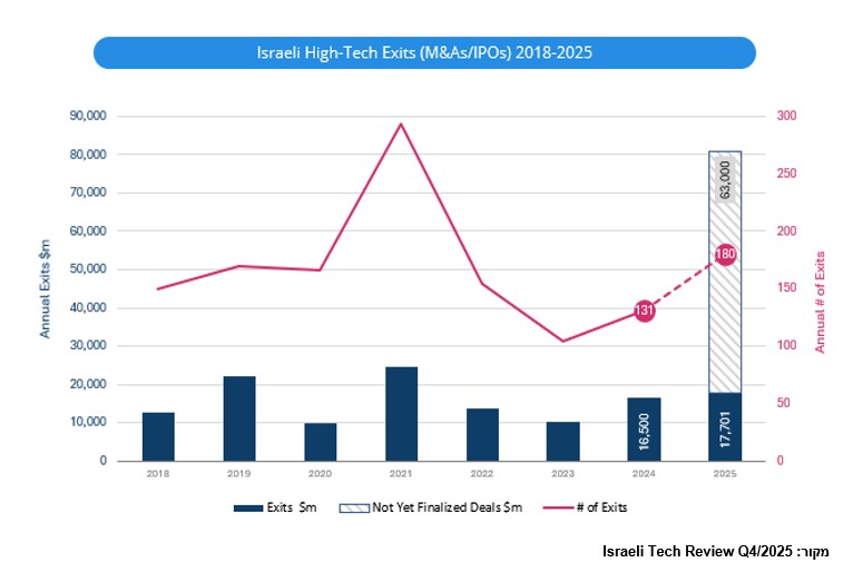 שנת 2025 בלטה גם מצד האקזיטים. השנה הסתיימה עם 180 עסקאות רכישה והנפקות ראשוניות (IPO) בסך של 17.7 מיליארד דולר. מלבד עסקאות אלו, נמצאות עוד 13 עסקאות רכישה בתהליך סגירה (כלומר הוכרז רשמית על הצעת הרכש, אך התהליך הרגולטורי עדיין לא הסתיים), שעשויות להוסיף עוד כ-63 מיליארד דולר מעבר להון שהתקבל בעקבות האקזיטים שהסתיימו ולהסתכם בקירוב ל-80 מיליארד דולר סה"כ.
