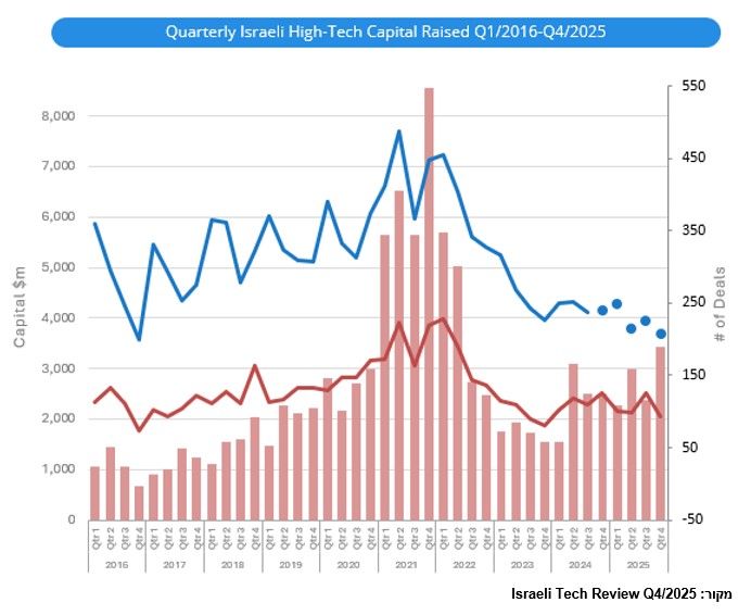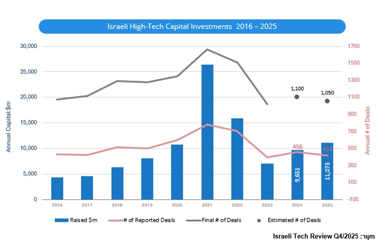גיוסי ההון ב-2025 הסתכמו ב-11.1 מיליארד דולר ב-418 סבבי גיוס, זינוק של 15% בהיקף גיוסי ההון לעומת 2024. מספר האקזיטים בהיי-טק הישראלי טיפס ל-180 עסקאות רכישה והנפקות ראשוניות שהסתכמו ב-17.7 מיליארד דולר