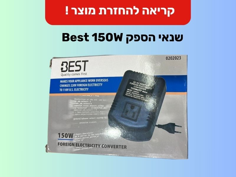 גם לכם יש את המוצר הזה בבית? שימו לב. קריאה להחזרת מוצר (recall) שנאי הספק Best 150W מבית המותג: Best. דגם 0202023, ברקוד: 0746739420978 אשר שווק בישראל עד התאריך: 16/10/2025.