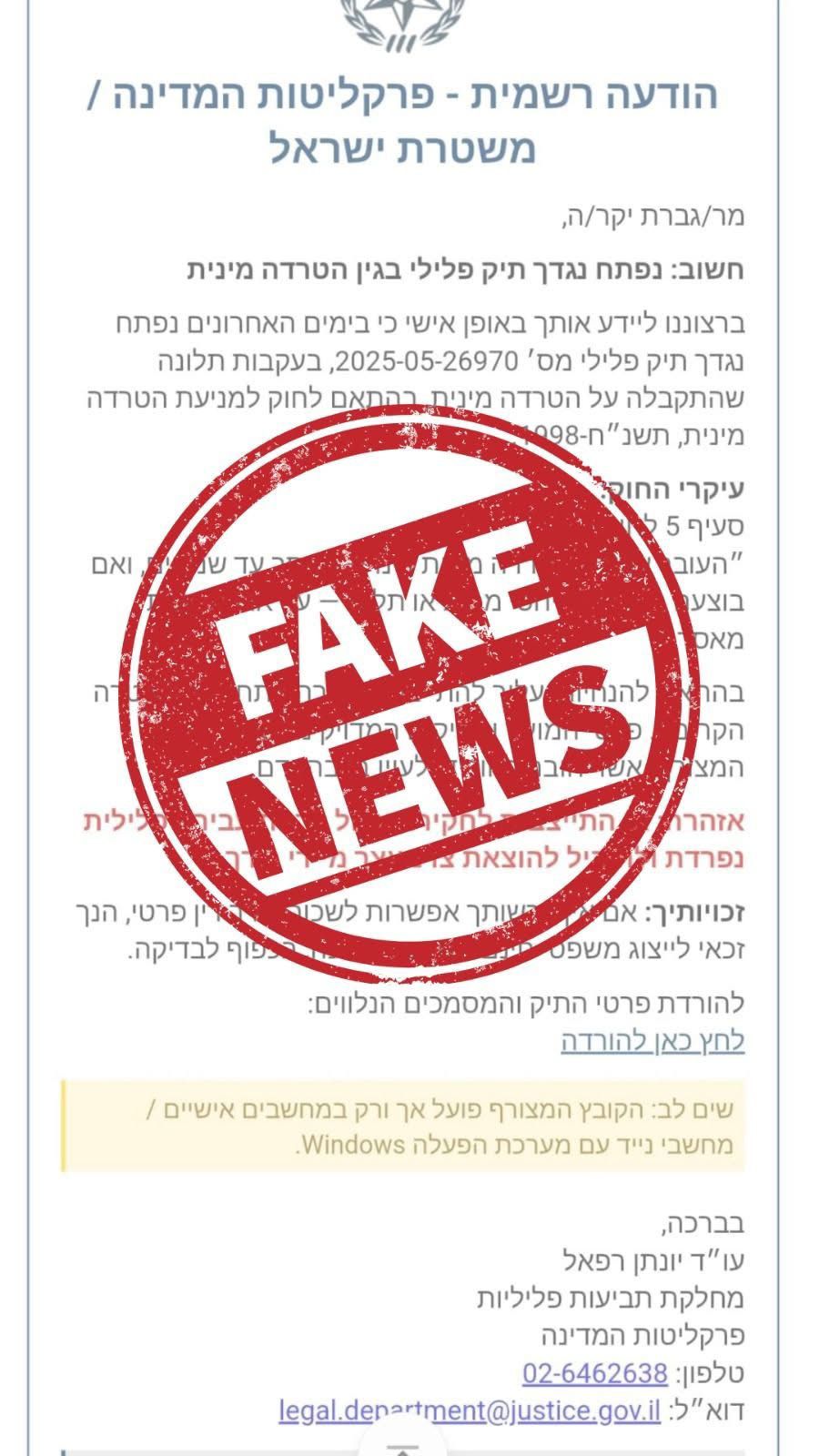 בהמשך המייל הזדוני, זימון לחקירה וקישור זדוני עבור "הורדת פרטי התיק והמסמכים הנלווים". כעת, פרקליטות המדינה מזהירה את הציבור מפני המתכתבים הללו. "המכתבים אינם אמיתיים ומדובר בהונאה", נכתב במודעה שקודמה על ידם ברשתות החברתיות.