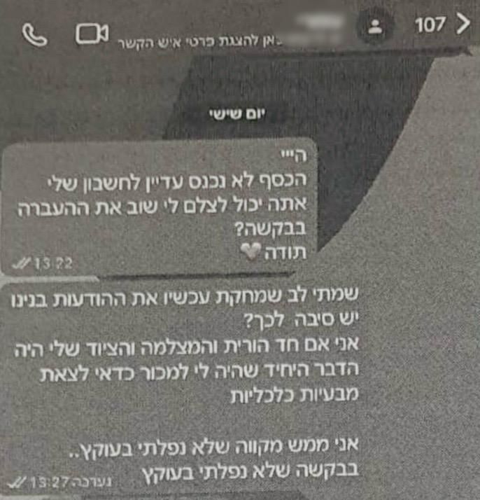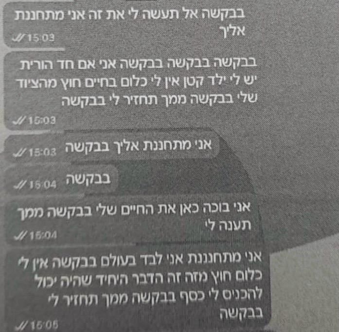 לאחר מקרה עוקץ זה, פנתה הקורבן אל החשוד בהודעות דרך הוואטסאפ והתחננה על נפשה שישיב לה את הציוד היקר בשל מצבה הכלכלי, לאחר שהבינה כי נפלה קורבן לתרמית העוקץ, אך גם פניות אלו מצדה, נפלו על אוזניים ערלות.