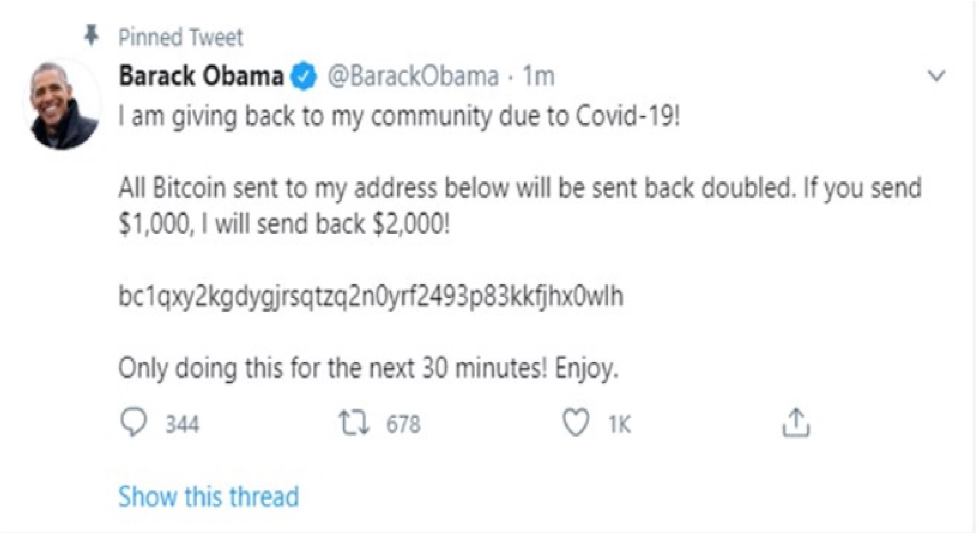 ההונאה שתעלה לטוויטר הרבה כסף: חשבונות רבים נפרצו הלילה, בהם של מפורסמים כמו ברק אובמה, קניה ווסט, קים קרדשיאן וג'ו ביידן ושל המיליארדרים אילון מאסק וג'ף בזוס. בחשבונות פורסמו ציוצים חריגים בהם נכתב, כי הם מעוניינים לתרום לקהילה ועבור כל סכום שיועבר לארנק הביטקוין הם יחזירו לשולח סכום כפול. כמו כן נכתב כי ההצעה תקפה למשך 30 דקות בלבד.