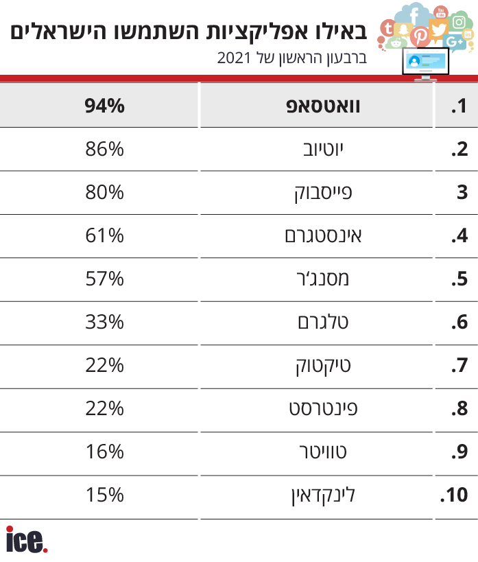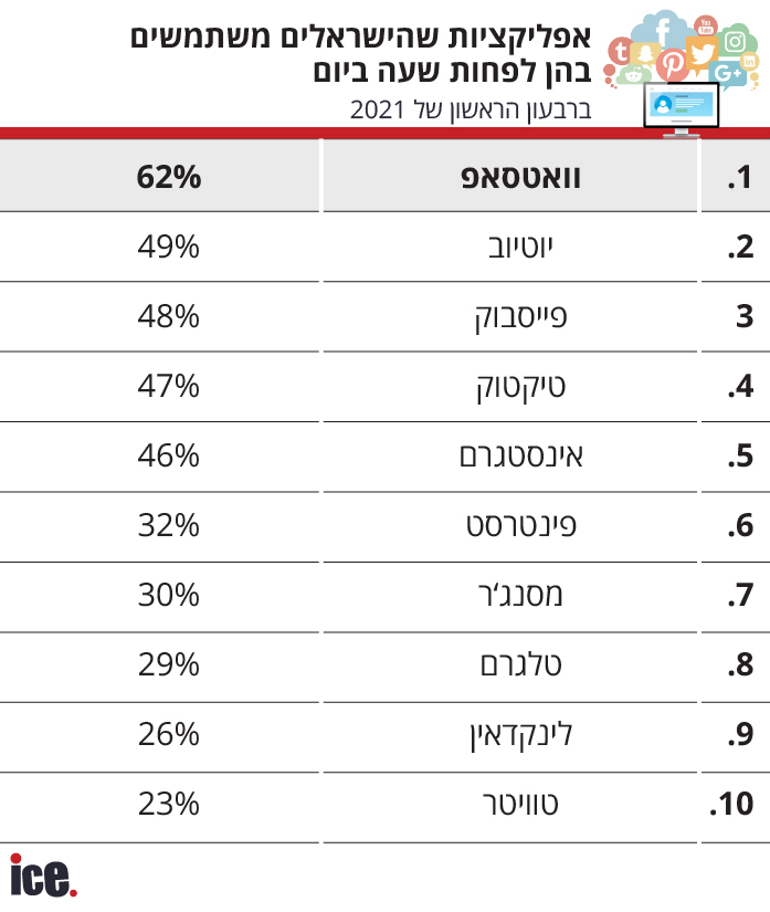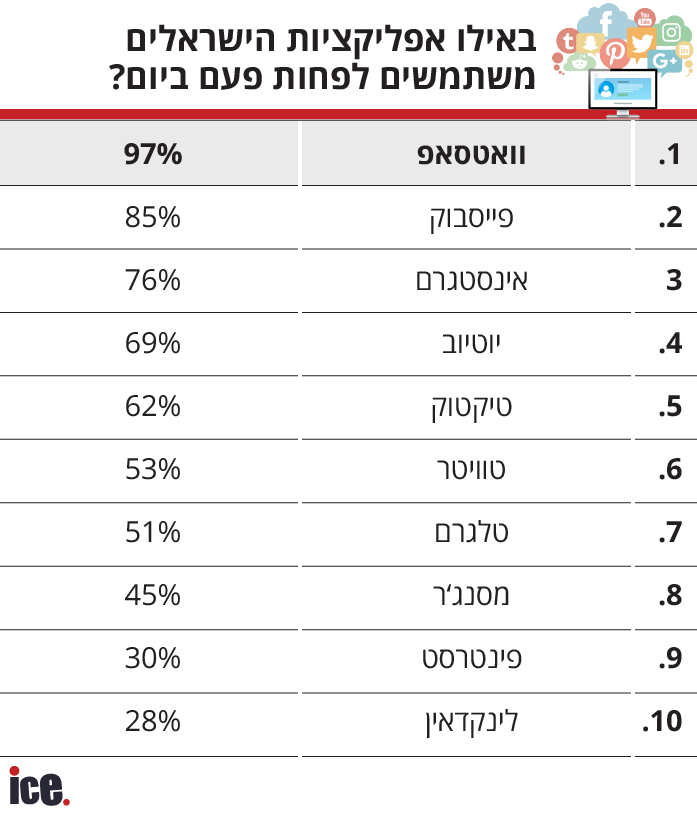 שלוש האפליקציות מבית פייסבוק הובילו במספר הישראלים שמדווחים כי הם נכנסים אליהן מספר פעמים ביום ובמספר הישראלים שדיווחו כי הם משתמשים בהן יותר משעה ביום.