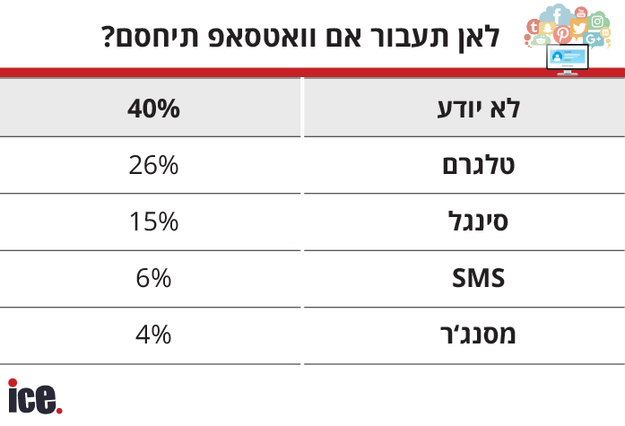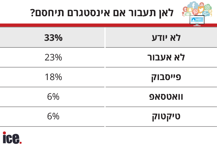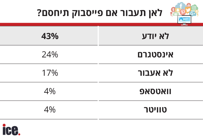 נתונים מעניינים שנחשפו בסקר כללו שאלות על האלטרנטיבות שישראלים היו עוברים עליהן אם כל אחד משירותי פייסבוק היה נחסם כאן: רובם השיבו כי אם פייסבוק תיסגר - יעברו לאינסטגרם, ולהיפך. רק סגירה של וואטסאפ תעודד את רוב הישראלים להשתמש בחלופות שאינן בבעלות פייסבוק. כשנשאלו אם הם רואים ביוטיוב תחליף לפייסבוק או לאינסטגרם, ענו רוב מוחלט של הישראלים "לא".