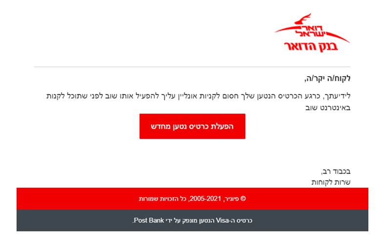 חברת אבטחת המידע ESET מתריעה מפני מייל זדוני המתחזה לדואר ישראל ומנסה לדלות פרטי אשראי. כותרת מייל ההונאה היא "חשוב הפעלת כרטיס נטען לקניות און ליין" ובמייל עצמו מעדכנים את הנמען כי "הכרטיס הנטען שלו חסום לקניות אונליין ועליו להפעילו שוב" לפני שיוכל להמשיך לקנות באינטרנט”.