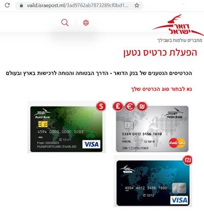 לאחר שהנמען מקליק על הקישור הוא מגיע לעמוד ההונאה בו הוא מתבקש לבחור בכרטיס הנטען שברשותו. כבר בראש העמוד הזה, ניתן להבחין כי כתובת האתר אינה של דואר ישראל.