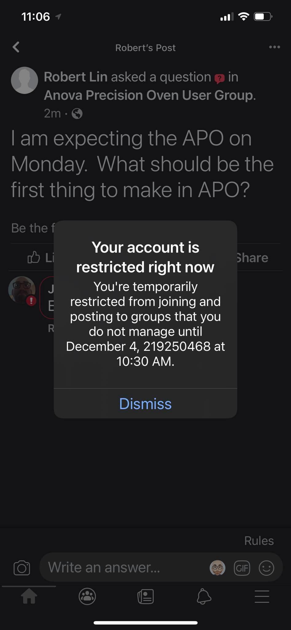 בסוף השבוע דיווח העיתונאי, שגוף התקשורת שהוא כותב בו קיים כמעט מאה שנה וכותב על טכנולוגיה כבר כמעט 70 שנה, על הודעה שקפצה על מסך האייפון שלו בזמן שניסה להגיב בקבוצה בה הוא חבר. "החשבון שלך מוגבל כרגע", נכתב בה. "אתה מוגבל כרגע מהצטרפות או העלאת פוסטים לקבוצות שאינך מנהל עד ה-4 בדצמבר 219250468 בשעה 10:00 בבוקר".