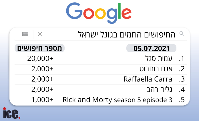 את חמישיית החיפושים הבולטים שפרסמה גוגל סוגר הפרק השלישי בעונתה החמישית של "ריק ומורטי", הסדרה המצוירת למבוגרים של נטפליקס, שכל פרק בעונה הנוכחית שלה זוכה ביום העלאתו להתברג לצמרת החיפושים בישראל.