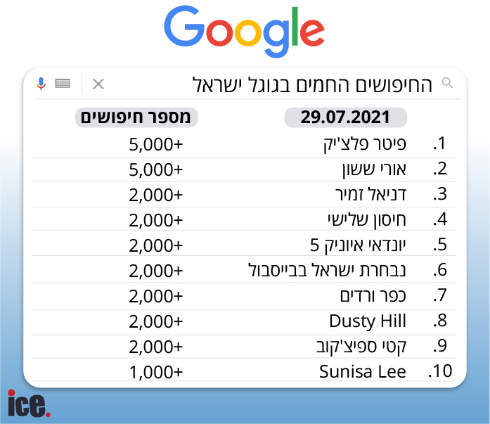 על הפודיום בטוקיו עוד לא ראינו מספיק ישראלים – אבל זה כנראה לא מפריע לנו לחפש כל אחד "משלנו" שעשוי לזכות במדליה. טבלת החיפושים החמים בגוגל אתמול מראה שגם ביום חסר ביצועים מרשימים, הספורטאים שלנו ביפן זוכים לתמיכה בבית: במקום הראשון ברשימה נמצא הג'ודוקא פיטר פלצ'יק, שהפסיד כבר בבית הניחומים; במקום השני נמצא אורי ששון, שהפסיד בסיבוב השני של אותו ענף; במקום השישי נבחרת ישראל בבייסבול, שאמנם הפסידה לנבחרת המקומית, אך עדיין עשויה לזכות במדליה בשל המספר הקטן של מתחרות בענף; ובמקום התשיעי נמצאת הגולשת קטי ספיצ'קוב, שגם היא וגם יואב כהן המתחרה במקביל באותו ענף הפסידו את הסיכוי למדליות השנה.