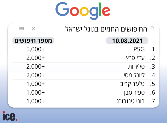 גוגל חוזה את העתיד – או לפחות מהווה אינדיקציה לא רעה בכלל לאירועים שאנשים מצפים שיקרו, ונוטים לקרות בסוף. מקרה הבוחן לתיאוריה הזו היום הוא החתימה של ליונל מסי הארגנטינאי בקבוצת פאריס סן-ז'רמן הצרפתית, מעט פחות משבוע לאחר שהודיע כי הוא עוזב את קבוצתו הקודמת, ברצלונה. עוד לפני ההכרזה על החתימה, התברג שמה של הקבוצה לראש טבלת החיפושים החמים של ישראלים בגוגל אתמול, מה שמזכיר כי פעמים רבות אירועים מעוררים עניין עוד לפני שבאמת קרו. מסי עצמו, אגב, נמצא רק במקום הרביעי.