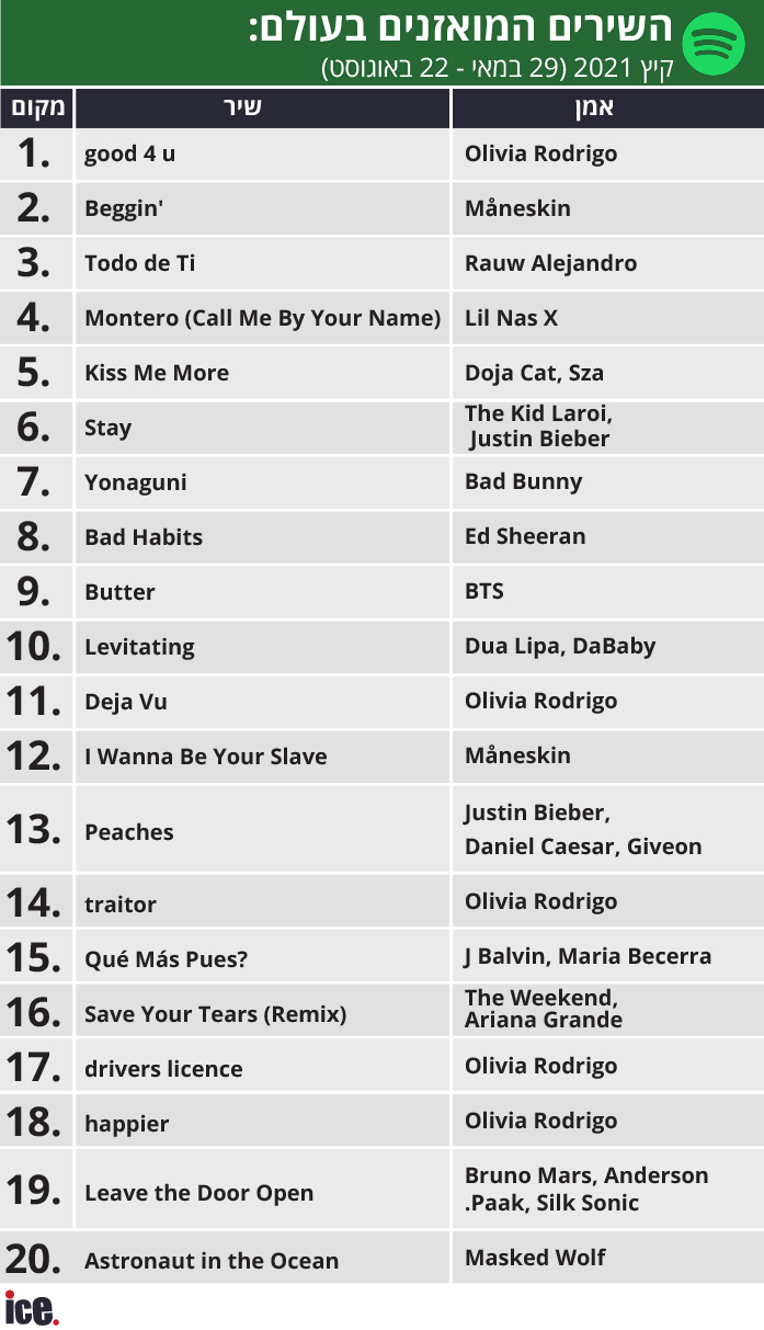 ספוטיפיי חשפה את רשימת השירים המושמעים ביותר בעולם בחודשים החמים. מי הזמרת שהשתלטה על רבע מהטבלה, ומי הלהקה שהפכה מאנונימית לחלוטין לפני מספר חודשים לאחת הפופולאריות בעולם?