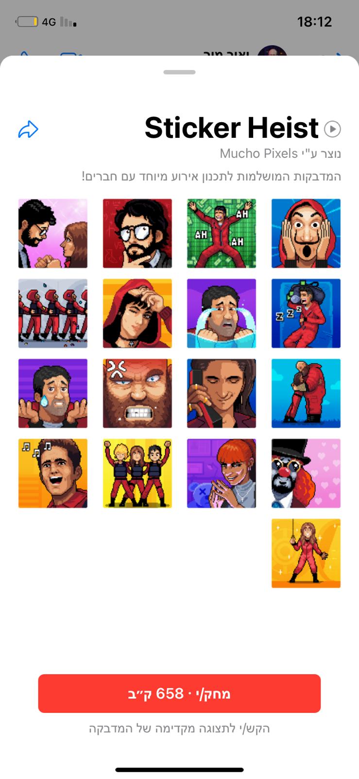 החבילה, שנוצרה על ידי אולפן המשחקים והגרפיקה Mucho Pixels, כוללת 17 סטיקרים מונפשים, ביניהם שודד במסיכת דאלי נדהם, שודד "שוחה" בשטרות כסף, הפרופסור מנסה לחשוב, הפרופסור עם ליסבון, ארתורו בוכה, טוקיו מסירה את המסיכה וקורצת, ברלין שר "בלה צ'או", אליסיה סיירה מצחקקת ועוד.