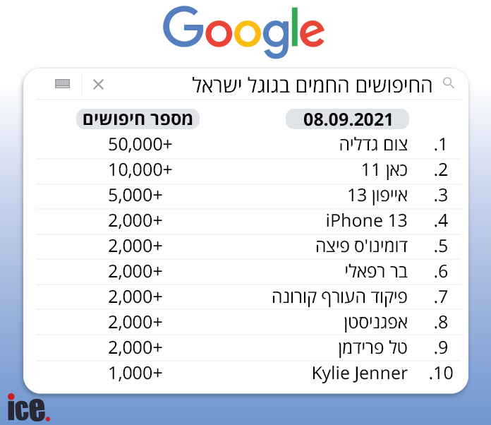 השנה העברית תשפ"ב נפתחה אתמול בנהירה המונית של ישראלים שחיפשו בגוגל את סדרת הטלפונים הבאה של אפל, אייפון 13, לאחר שהחברה שלחה הזמנות לאירוע ההכרזה הווירטואלי על המכשירים החדשים שישברו מן הסתם את שיאי המכירות של קודמיהם, כפי שעשו אלה בתורם. שם הסדרה תפס שני מקומות בצמרת טבלת החיפושים החמים בגוגל ישראל, עם בין 7,000 ל-15,000 חיפושים.