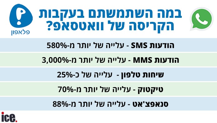 בעקבות אי האפשרות להשתמש בשירות של אפליקציית המסרים הפופולארית, פלאפון הצביעה על גידולים משמעותיים בשיחות הטלפון, שליחת הודעות SMS במתכונתן הוותיקה וושימוש באפליקציות אחרות לשליחת מסרים, כאשר הדבר נמדד בין השעות 19:00-23:00.