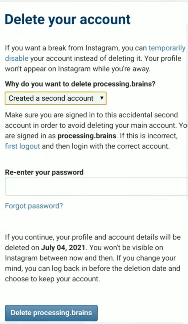 לאחר שכתבתם את הסיסמא לחצו למטה בלחצן Delete עם שם החשבון שלכם כדי למחוק אותו באופן סופי. יש לציין שהמחיקה היא מוחלטת ולא תוכלו לשחזר שום פרט או תמונה מן החשבון לאחר המחיקה.