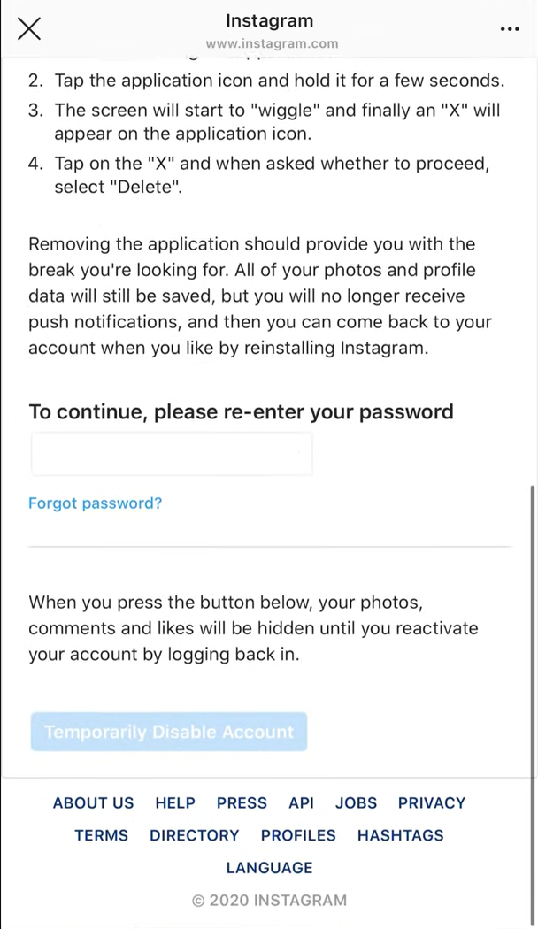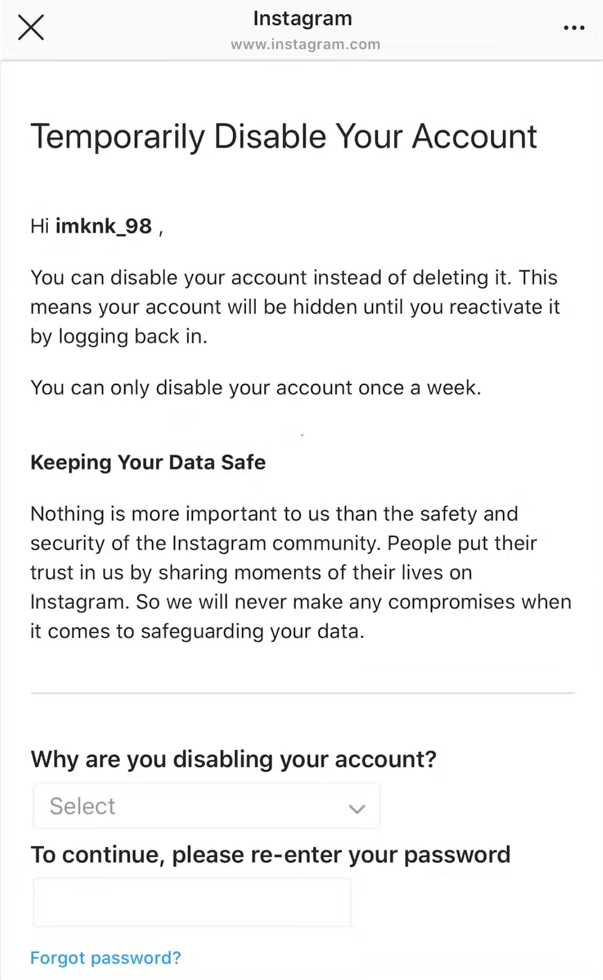 אם אתם רוצים קצת שקט מהאינסטה אבל לא מעוניינים למחוק את החשבון או את האפליקציה, יש לכם אפשרות להשבית את החשבון כך שלזמן מסויים, עד שתבחרו לחזור, החשבון יועלם מהרשת. לאחר שתבחרו לסיים את ההשבתה החשבון יחזור לקדמותו עם כל הפרטים והפוסטים שלכם