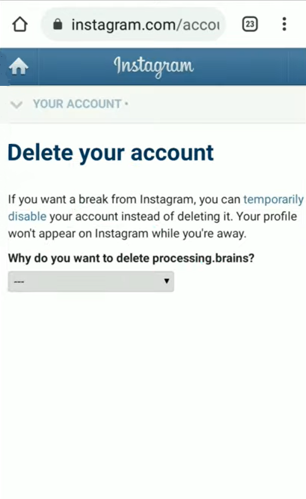 כאן בחלון הקטן באמצע האינסטגרם יבקש מכם לציין את הסיבה שבגללה אתם רוצים למחוק את החשבון, בחרו סיבה:
