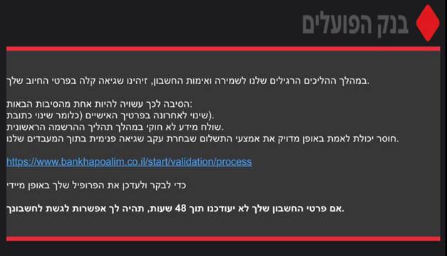 ניתן לראות כי בניסוח כושל (אשר אמור להדליק אצלנו נורה אדומה), מציינים כי "כדי לבקר ולעדכן את הפרופיל באופן מיידי, אם פרטי החשבון שלך לא יעודכנו תוך 48 שעות, תהיה לך אפשרות לגשת לחשבונך". כלומר מבקשים מהנמענים לגשת לקישור ולעדכן את הפרטים.