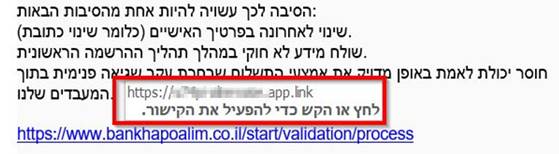 טיפ לבדיקת קישור שקיבלתם במייל: הקישור שבמייל אמנם נראה "תקין" ומשתמש בדומיין של בנק הפועלים. אבל, כאשר מניחים את העכבר עליו ניתן לראות את הכתובת אליה מגיעים, וכאן רואים שמדובר בכלל באתר עם קישור אחר. משתמש שנמצא ללא הגנה על המכשיר, יכול להקליק על הקישור ולנחות באתר הזדוני (בשונה ממשתמשים אשר יש להם הגנה ולמעשה נמנעת מהם גישה לאתרים מהסוג הזה).