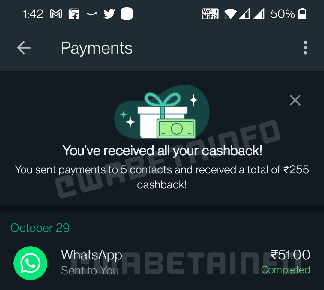 משתמש של האתר שלח לו תמונה שמציגה הודעה שקיבל מהשירות לאחר שהשתמש בתכונה החדשה שלו, המאפשרת לשלוח דרכו כסף למשתמשים אחרים – בין אם מדובר בבתי עסק או חברים. ההודעה מראה שהמשתמש הנידון שלח סך של 255 רופי – המטבע המקומי בהודו – וקיבל חזרה מהחברה 51 רופי. מדובר בהחזר של 20% - שיעור גבוה באופן חריג בתחום הזה, שבדרך כלל נע באזורי האחוזים החד-ספרתיים.