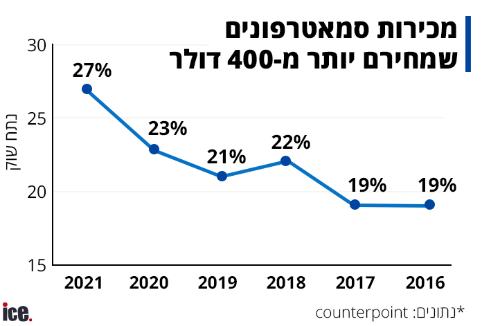 אך ב-2021 קרתה הפתעה, ונתח השוק של המכשירים המתקדמים זינק אף יותר מבשנה הקודמת, ל-27%. מבחינת המכירות, מדובר על זינוק של 24% - יותר מפי שלושה מהזינוק במכירות כלל הסמארטפונים בעולם, שעלו בשנה הזו ב-7%. במלים אחרות, אם לפני המגפה כל מכשיר חמישי שנמכר בעולם עלה יותר מ-400 דולר, כעת מדובר על כל מכשיר רביעי לפחות.
