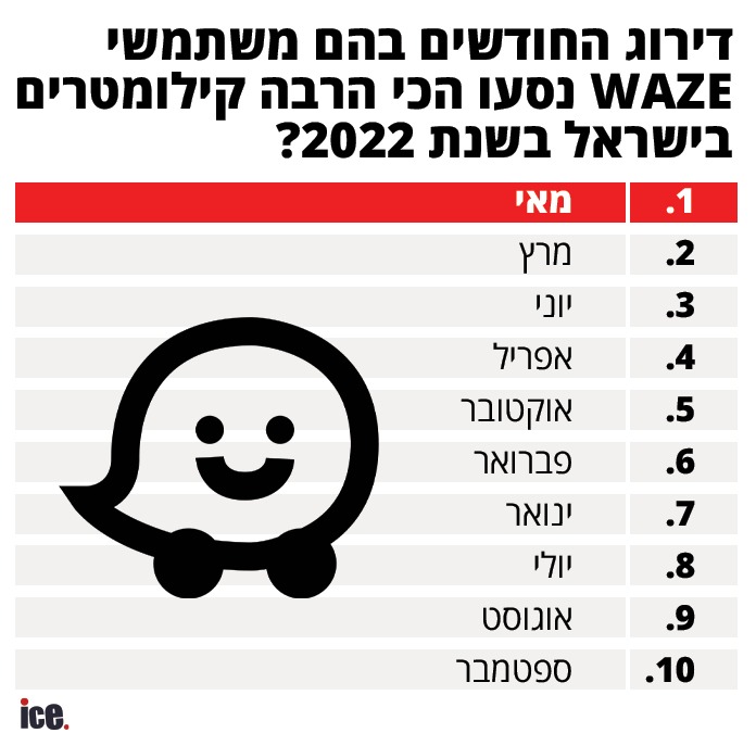 על פי נתוני WAZE, בחודשים ספטמבר-אוקטובר 2022 נרשמה עלייה ממוצעת של חמישה אחוזים בהשוואה לחודשים הזהים אשתקד. הערים המובילות בעומס התנועה בישראל הן תל אביב, ירושלים וראשון לציון והחודשים בהם נמדדה הנסועה הגבוהה ביותר בקרב משתמשי היישומון הינם מאי, מרץ ויוני.