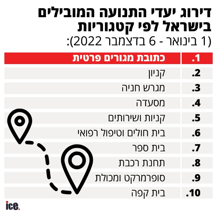 עוד עולה מנתוני סיכום השנה, כי בראש יעדי הניווט של משתמשי WAZE בישראל, אחרי כתובות מגורים וקניונים, סוגר את שלושת היעדים המובילים לפי קטגוריות, היעד "מגרש חנייה".