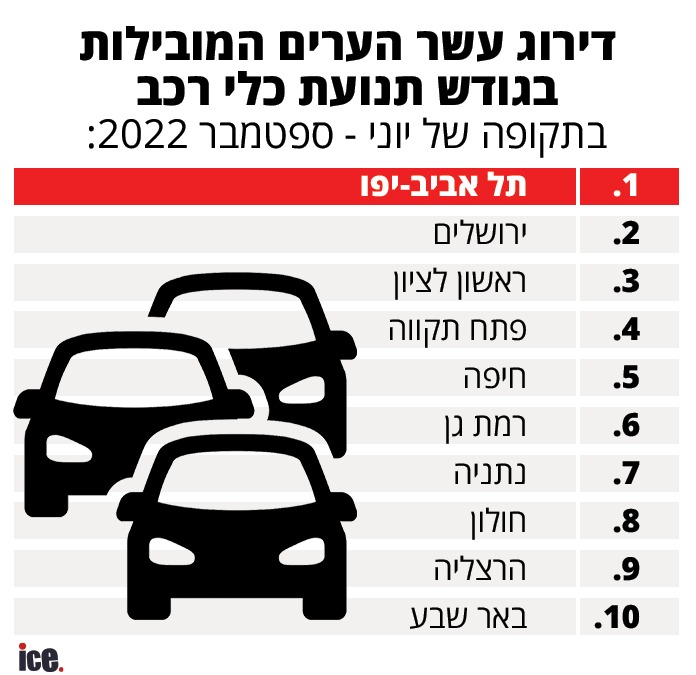 לפי ערים, התנועה בתל אביב עלתה ב-2% במהלך ספטמבר - אוקטובר '22 מאשר בספטמבר - אוקטובר '21. התנועה בירושלים עלתה ב-6% במהלך ספטמבר - אוקטובר '22 מאשר בספטמבר - אוקטובר '21 ואילו התנועה בראשון לציון עלתה ב-6% במהלך ספטמבר - אוקטובר 22 מאשר בספטמבר - אוקטובר 21.