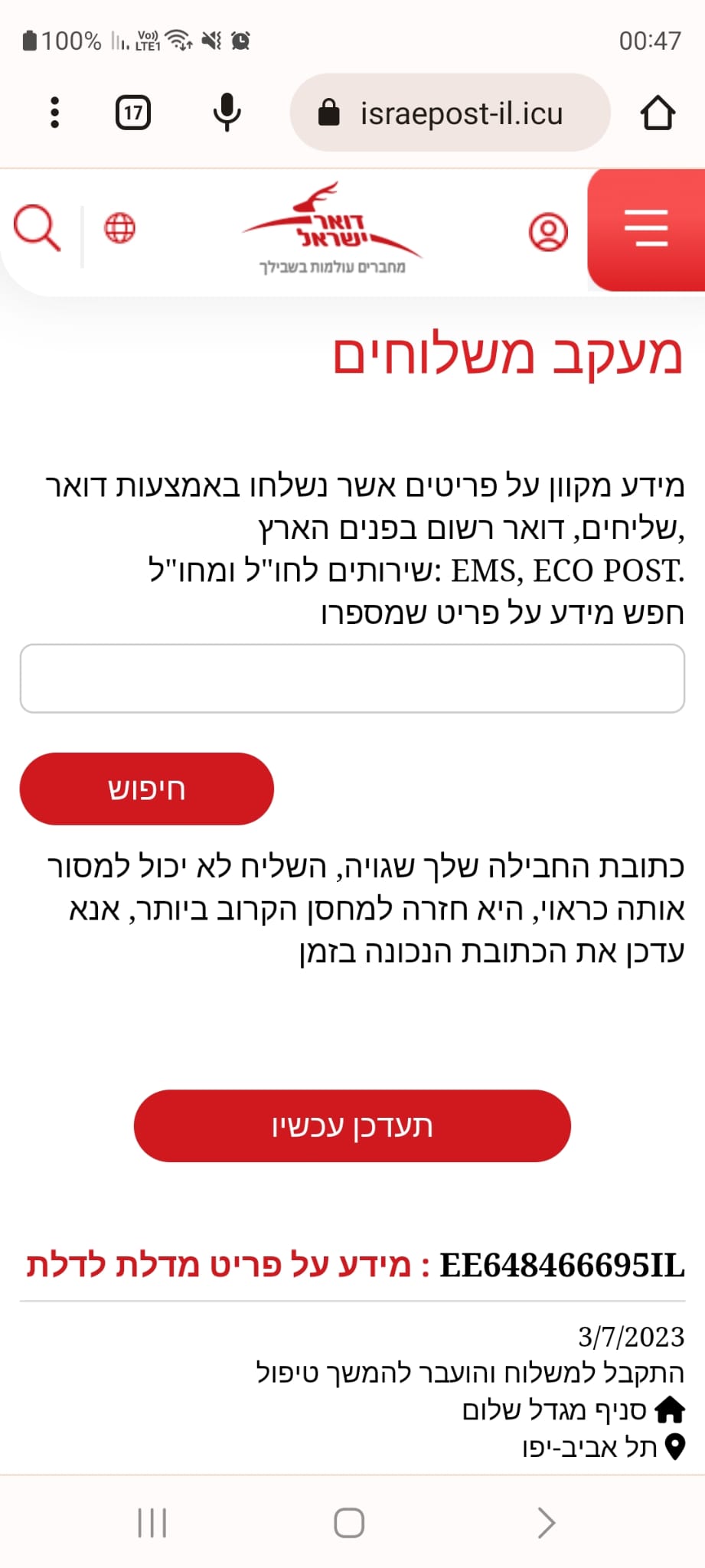 בהודעה שמגיעה אל המכשיר הסלולרי נכתב: "הכתובת של החבילה שלך שגויה, אנא אשר את הכתובת", מצורף גם קישור עם עמוד נחיתה אליו נכנסים והוא נראה מהימן לחלוטין להשארת הפרטים, אך חייבים להזהר".