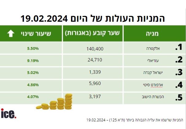 ישראל קנדה עלתה ב-5.02% והגיעה לרמה של 1,339 נקודות, מניית ארפורט סיטי עלתה היום ב-4.86% לרמה של 5,960 נקודות והחמישית בטבלת העולות היומית היא מניית הכשרת היישוב שעלתה היום ב-4.07% לרמה של 3,197 נקודות.