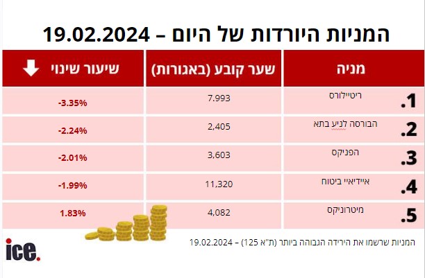 אחריה נמצאת מניית הפניקס שירדה ב-2.01% לרמה של 3,603 נקודות. מניית איידי איי ביטוח ירדה ב-1.99% לרמה של 11,320 נקודות ואת חמישיית היורדות סגרה מיטרוניקס שירדה היום ב- 1.83% לרמה של 4,082 נקודות.