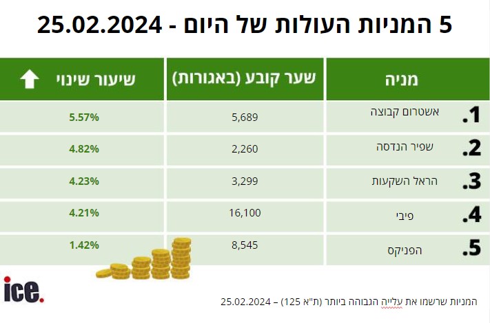 מניית אשטרום זינקה היום וביצעה קפיצה משמעותית, כאשר בסיום יום המסחר נרשמה עלייה של 5.57% ועלייה לרמה של 5,689 נקודות. אחריה ברשימת המניות העולות היא שפיר הנדסה שעלתה היום ב-4.82% לרמה של 2,260 נקודות.