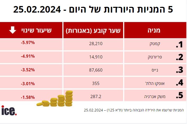 בקרב המניות היורדות של היום, המפסידה הגדולה היא חברת "קמטק". על פי הנתונים, מנייתה צנחה ב-5.97% לרמה של 28,210 נקודות. במקום השני, חברת "פריורטק", שמנייתה פחתה ב-4.91% לרמה של 14,910 נקודות. חברה נוספת שרשמה הפסד משמעותי בגזרת המניות היא חברת "נייס". על פי הנתונים, מנייתה ירדה ב- 3.52% לרמה של 87,660 נקודות. אחריה, חברת "אופקו הלת" שמנייתה פחתה ב-3.01% לרמה של 355 נקודות. במקום החמישי והאחרון, נמצאת חברת "משק אנרגיה", מנייתה ירדה ב-1.58% לרמה של 287 נקודות.