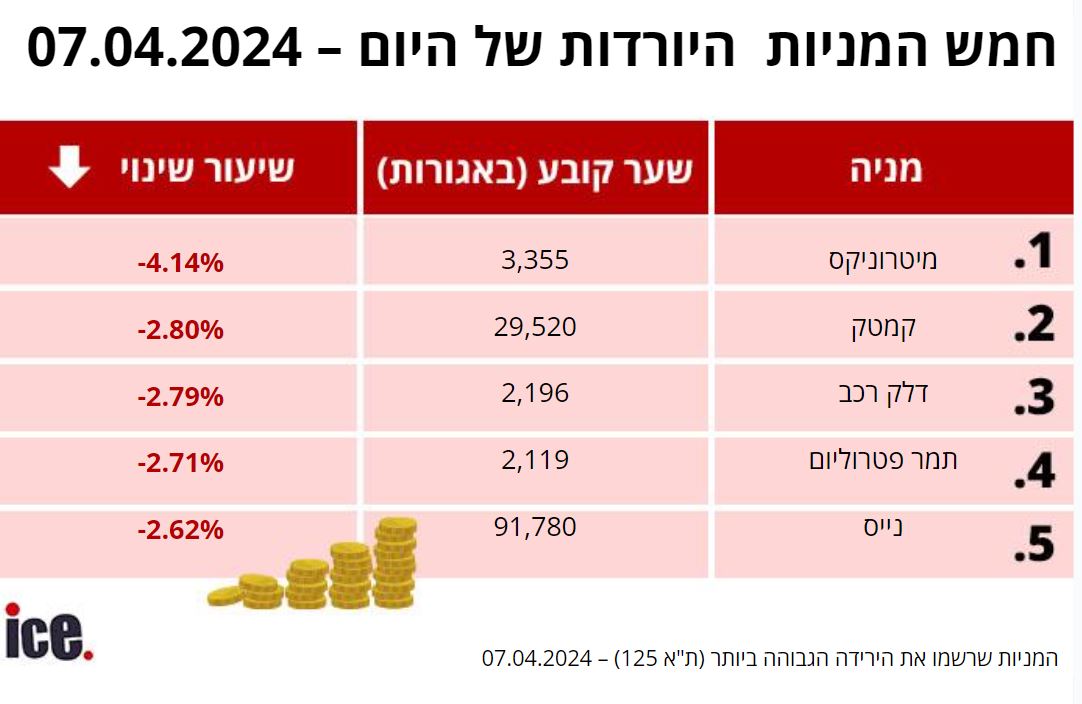 ומבין ה"מפסידות" של היום, מנייתה של מיטרוניקס ירדה בשיעור של 4.41% לרמה של 3,355 אגורות. אחר כך, המנייה של חברת קמטק ירדה בשיעור של 2.80% לרמה של 29,520 אגורות. דלק רכב ירדה בשיעור של 2.79% לרמה של 2,196 אגורות. במקום הרביעי, תמטר פטרוליום ירדה בשיעור של 2.71% לרמה של 2,119 אגורות. במקום האחרון בטבלה, מנייתה של נייס ירדה בשיעור של 2.62% לרמה של 91,780 אגורות.