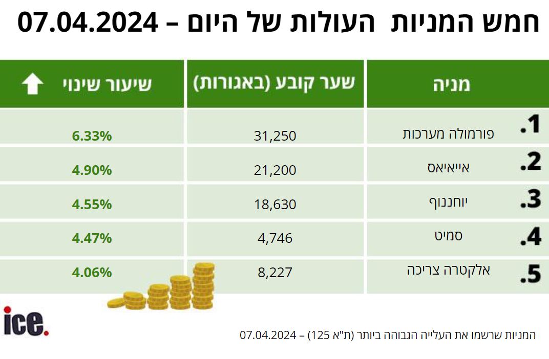 המנייה שהציגה את השינוי היומי החיובי ביותר הייתה פורמולה מערכות, אשר עלתה בשיעור של 6.33% לרמה של 31,250 אגורות. מנייתה של אייאייאס עלתה בשיעור של 4.90% לרמה של 21,200 אגורות. יוחננוף עלתה גם כן בשיעור של 4.55% לרמה של 18,630 אגורות. במקום הרביעי, המנייה של סמיט עלתה ב-4.47% לרמה של 4,746 אגורות. אלקטרה צריכה עלתה ב-4.06% לרמה של 8,227 אגורות.