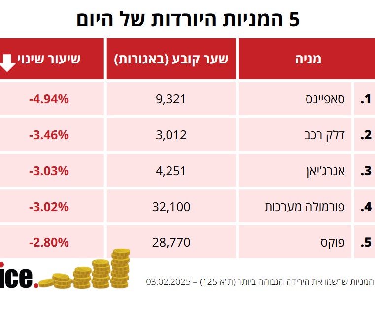 בקרב חמש המניות היורדות, המפסידה היא חברת סאפיינס שמנייתה ירדה ב-4.94% לרמה של 9,321 אגורות. מנייתה של חברת דלק רכב צנחה ב-3.46% לרמה של 3,012 אגורות.