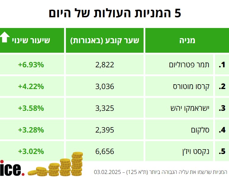בקרב חמש המניות העולות, המנצחת הגדולה היא חברת תמר פטרוליום שמנייתה עלתה ב- 6.93% לרמה של 2,822 אגורות. במקום השני, ניצבת חברת קרסו מוטורס שמנייתה צמחה ב-4.22% לרמה של 3,036 אגורות.