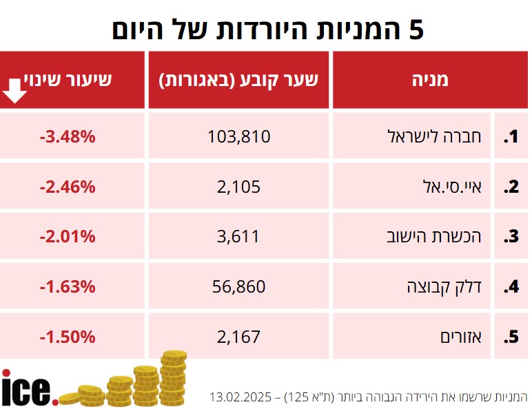 אחריה, ניצבת חברת הכשרת הישוב שמנייתה ירדה ב-2.01% לרמה של 3,611 אגורות. במקום הרביעי, מופיעה חברת נקסט ויז'ן שמנייתה צנחה ב-1.84% לרמה של 7,200 אגורות. מניית קבוצת דלק ירדה ב-1.63% לרמה של 56,860 אגורות. במקום החמישי, ניצבת חברת אזורים שמנייתה פחתה ב-1.50% לרמה של 2,167 אגורות.
