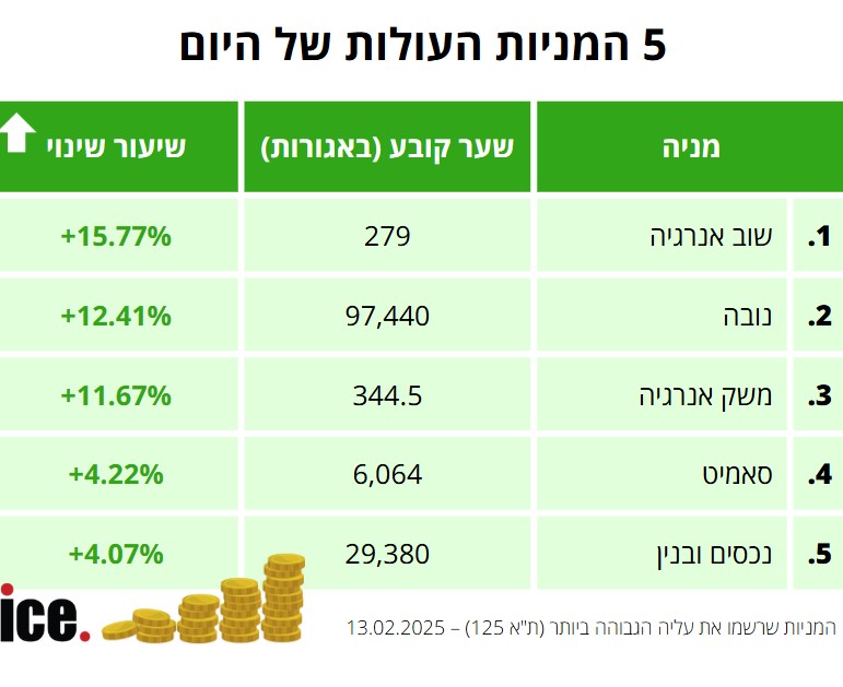 בקרב חמש המניות העולות, המנצחת הגדולה היא חברת שוב אנרגיה שמנייתה עלתה ב-15.77% לרמה של 279 אגורות. במקום השני, ניצבת חברת נובה שמנייתה עלתה ב-12.41% לרמה של 97,440 אגורות.