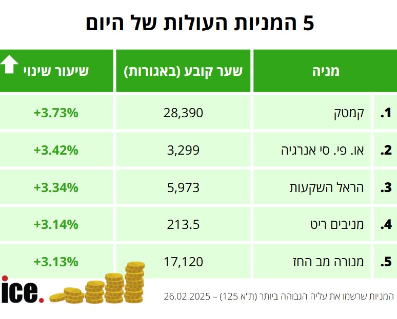בקרב חמש המניות העולות, המנצחת הגדולה היא חברת קמטק שמנייתה עלתה ב-3.73% לרמה של 28,390 אגורות. נתון חיובי זה נרשם לאחר שהחברה הישראלית פרסמה את התוצאות הכספיות מדו"ח הרבעון הרביעי לשנת 2024.