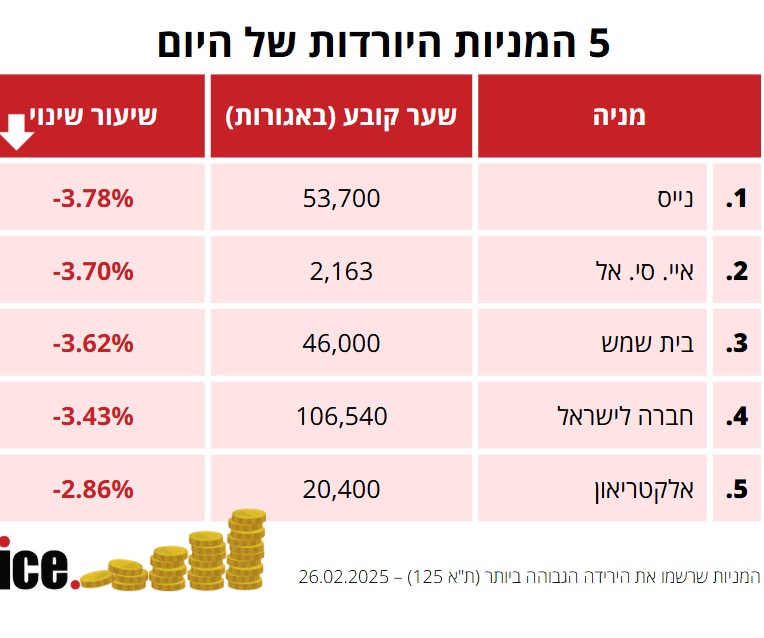בקרב חמש המניות היורדות, המפסידה היא חברת התוכנה נייס שמנייתה ירדה ב-3.78% לרמה של 53,700 אגורות. נתון שלילי זה, נרשם לאחר שנודע על התפקיד החדש של ברק עילם, מנכ"ל נייס לשעבר. כזכור, אמש (שלישי) דווח כי לאחר 25 שנים בחברה, עילם התמנה לדירקטור בחברת הפינטק 'פיוניר'. מנייתה של חברת איי.סי.אל צנחה ב-3.70% לרמה של 2,163 אגורות.