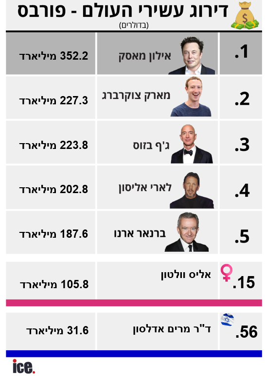 כהרגלו בקודש, דירוג עשירי העולם של מגזין "פורבס" פורסם גם השבוע ומציג נתונים מעניינים במיוחד. לאחר שמניית טסלה איבדה בחודש האחרון 30.32%, אילון מאסק ממשיך להפסיד מיליארדים. השבוע, מאסק שממשיך להחזיק בתואר האיש העשיר ביותר בעולם הפסיד 5 מיליארד דולר, מה שמביא את הונו האישי לסכום של 353.2 מיליארד דולר.
