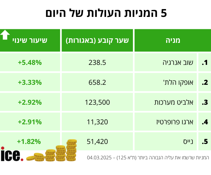 על פי נתוני הבורסה לניירות ערך בתל אביב, מדד ת"א 35 ירד ב-1.83% לרמה של 2,451.69 נקודות, ומדד ת"א 125 יורד ב-2.10% לרמה של 2,511.14 נקודות. מניית "שוב אנרגיה" עולה ב-5.48%