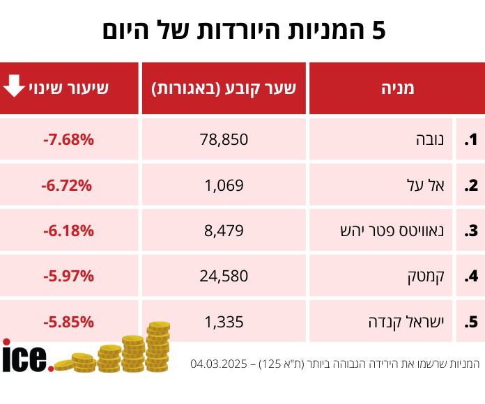 בחמש המניות היורדות של היום המפסידה היא, מניית נובה שיורדת ב-7.68% לרמה של 78,850 אגורות. אחרי שהציגה עליות, המנייה של אל על יורדת ב-6.72% לרמה של 1,069 אגורות, ותופסת את המקום השני.