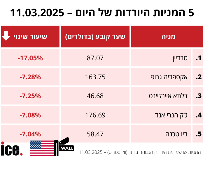במנניות היורדות עולה כי טרדיין צנחה בשיעור של 17.05%, אקספדיה גרופ בשיעור 7.28%, ודלתא איירליינס עם ירידה של 7.25%. אחריהן ג'ק הנרי אנד אסוסייטס (-7.08%) ובניו טכנה (-7.04%).