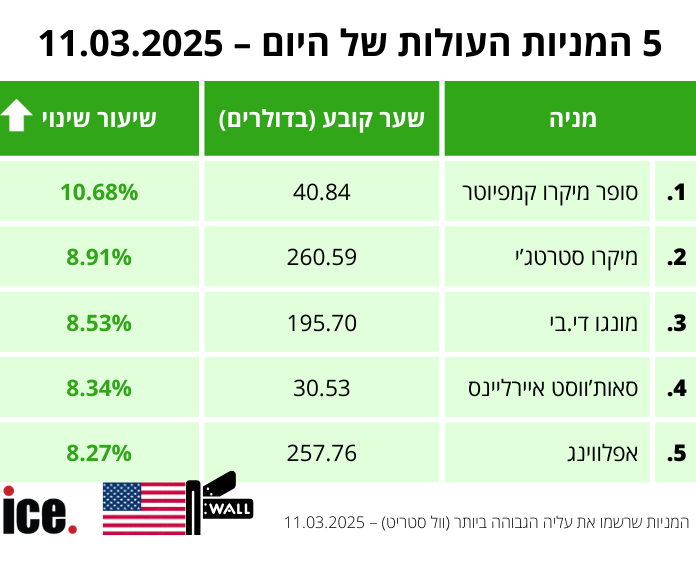 לאחר הסערה אתמול בוול סטריט, מדירוג המניות העולות והיורדות עולה תמונה מורכבת. המניה של סופר מיקרו קמפיוטר עלתה בשיעור של 10.68% לשער של 40.84 דולר. המניה של מיקרו סטרטג'י במקום השני עלתה בשיעור של 8.91% לשער של 260.59 דולר. אחריהן מונגו דיגבי (+8.53%), סאותווסט איירליינס (+8.34%) ואפלווינג (8.27%+).
