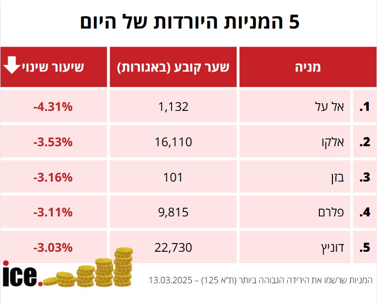 במקום השלישי, מופיעה חברת בזן שמנייתה פחתה ב-3.16% לרמה של 101 אגורות. מנייתה של חברת פלרם ירדה ב-3.11% לרמה של 9,815 אגורות. במקום החמישי, מופיעה חברת דוניץ שמנייתה פחתה ב-3.03% לרמה של 22,730 אגורות.